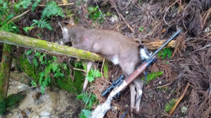 日の出から入った1箇所目、4つ目のポイントで最初に笛を吹いてから12分経過した時、背後に気配を感じて振り返ると、小型の♂1頭がこちらを向いて立っているのが見えた。私が動いたことで少し奥へと逃げたが、再度笛を吹くと、回り込むようにゆっくり近づいて来る。地形でシカの姿が見えなくなったタイミングで銃を構え、撃ちやすい位置までシカが移動したところで1発を発砲。撃たれた個体が谷へ落ちていくのが見えたので、脱砲して近づきナイフで首元を切って止め刺しした。
