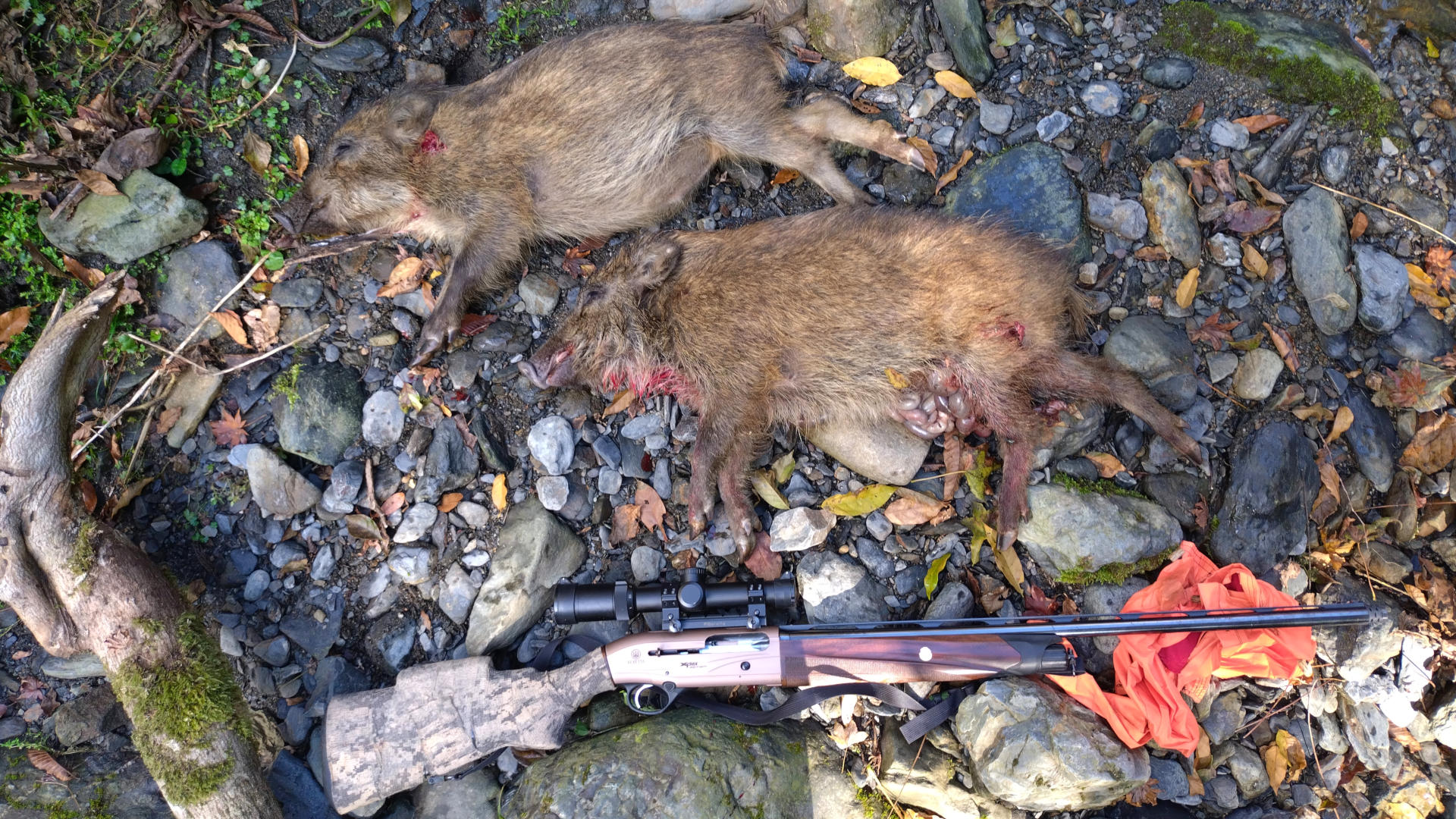 2024年11月12日 (猪・鹿を対象とした猟期の拡張期間)に、歩き流し猟でイノシシ♂2頭 (幼獣)を捕獲することができた。